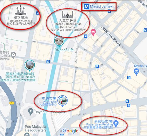 • 搭LRT粉紅(5號)線到Parsa Seni 站(先到茨廠街由南往北走);或是Masjid Jamed下車(先到佳美清真寺由北往南走)。