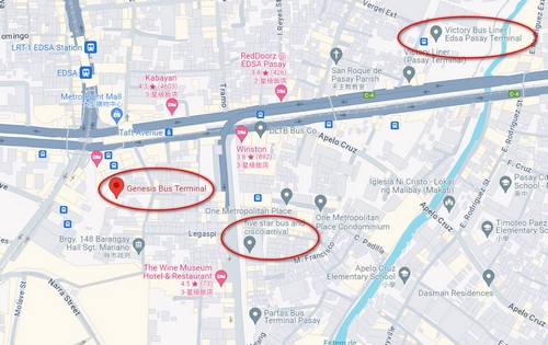 帕賽市Pasay,位在馬尼拉國際機場北邊,鄰近機場。這個區域聚集非常多家的巴士轉運站,上面提及的三家巴士公司,這裡都有,各家的地點,請見如下: