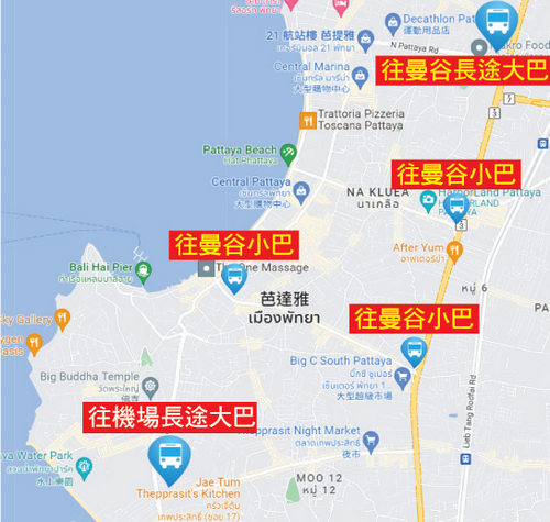 如果是廊曼機場往芭達雅,可以在機場搭乘A1線公車,到”Mo Chit巴士站”,在轉搭往芭達雅巴士到”芭達雅北路巴士站”;或是搭乘機場的SUTTLE BUS到蘇汪那普機場,在轉搭巴士到芭達雅中天巴士站。