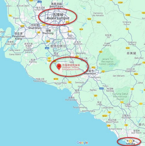 - 吉隆坡國際機場位在吉隆坡市區與馬六甲之間,如果有計畫前往馬六甲且住宿的遊客,或可安排下機後直接前往馬六甲。(參見下面地圖)
