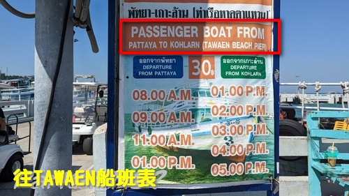 至於前往格蘭島的時刻表,請參見下面二張圖,一張是去Tawaen pier, 一張是去Na Baan Pier,票價則是二條線都是30泰銖。